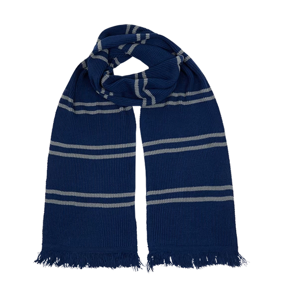 The scarf features the Ravenclaw colours of blue and silver and is finished with blue tassels. The scarf measures 200cm long and 30cm wide.Â