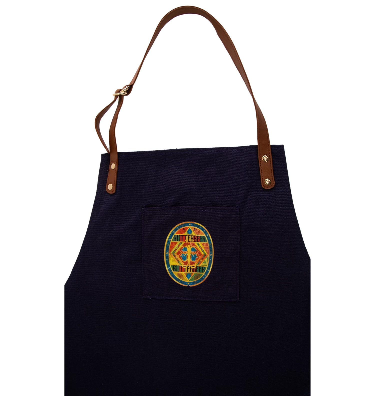 Available in a navy-blue denim-like design, the apron has an adjustable neck strap and large utensil pocket to line the bottom, accented in a soft brown vinyl material and gold colour hardware.
