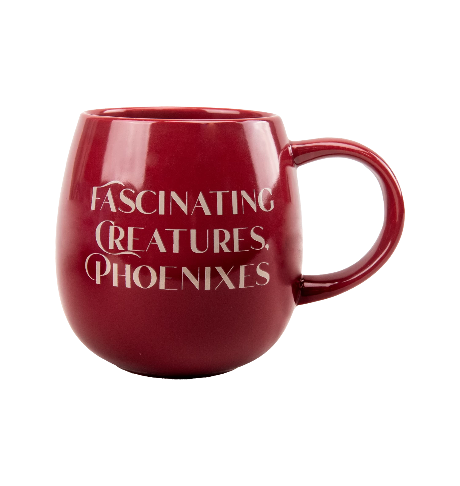 This burgundy red Fawkes mug features the collection’s signature exclusive artwork of a cute but inquisitive Fawkes the phoenix printed on the front. He sits perched on his stand under a gothic arch in Dumbledore’s office, along with prominent scrolling font of his name. Dumbledore’s famous quote “Fascinating creatures, phoenixes” is written on the back side in light grey writing.