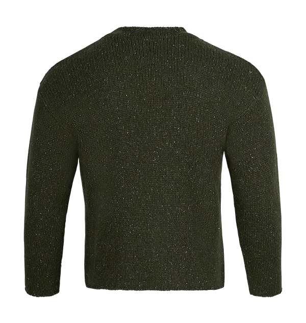 The jumper features a bold initial ‘F’ knitted into the front on a green coloured material.