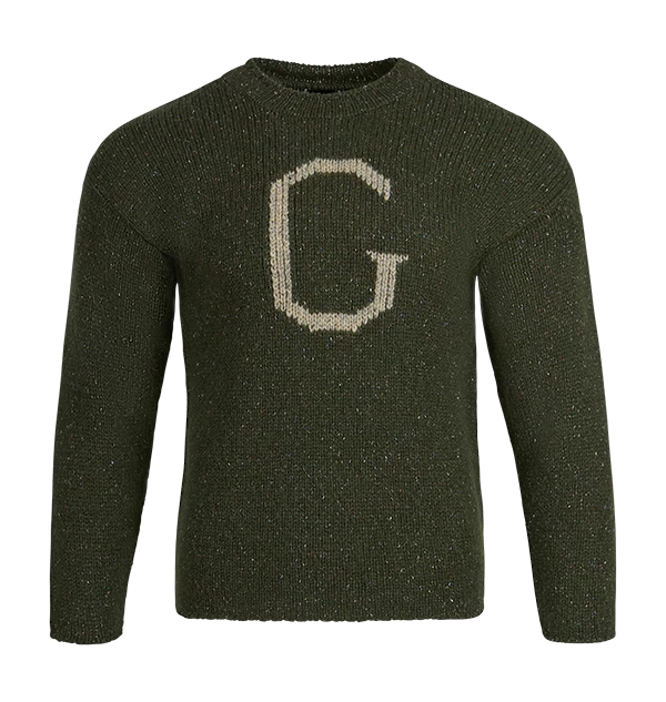 The jumper features a bold initial ‘G’ knitted into the front on a green coloured material.