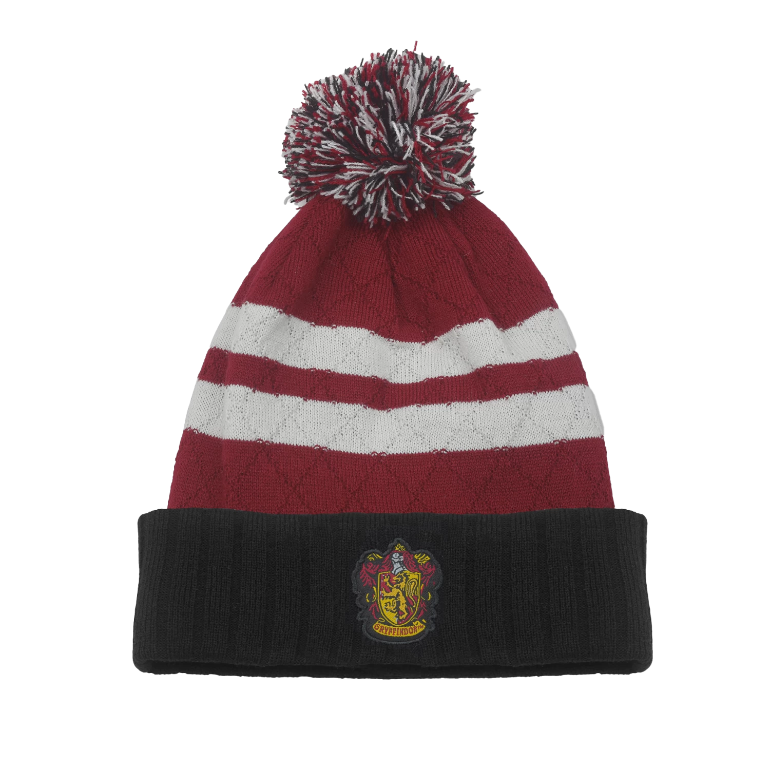 The iconic Gryffindor crest is embroidered into the center of the hat and overlaid on a black background. The bobble on the top of the hat is coloured with red and white tassels.