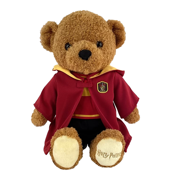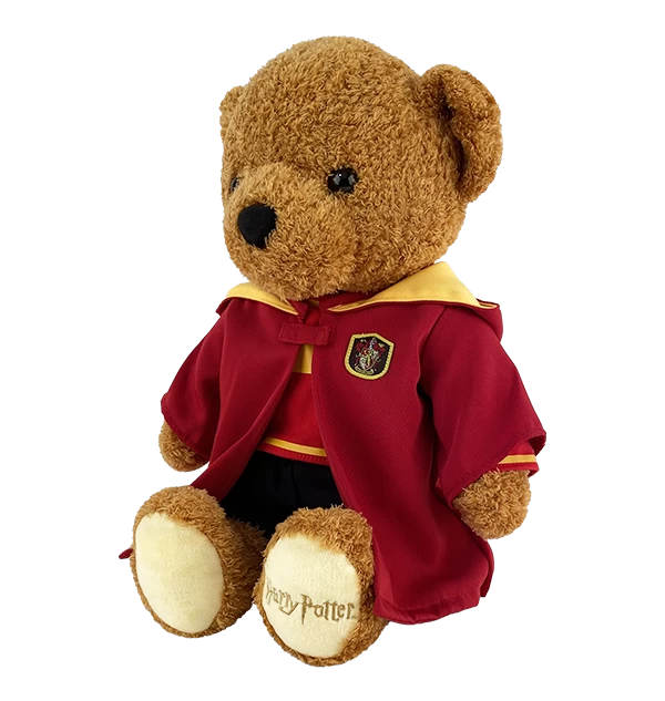 The soft brown teddy bear is dressed up in a Gryffindor seeker uniform very much like Harry Potter’s own and represents house Gryffindor in a stylish crimson red. His deluxe robe comes lined in a brilliant canary yellow, fastens with a Velcro closure, and features a tiny detailed Gryffindor patch on the chest. He also wears a handsome removable red and yellow striped shirt and pair of black trousers. The official Harry Potter logo embroidery can be found on his right foot.