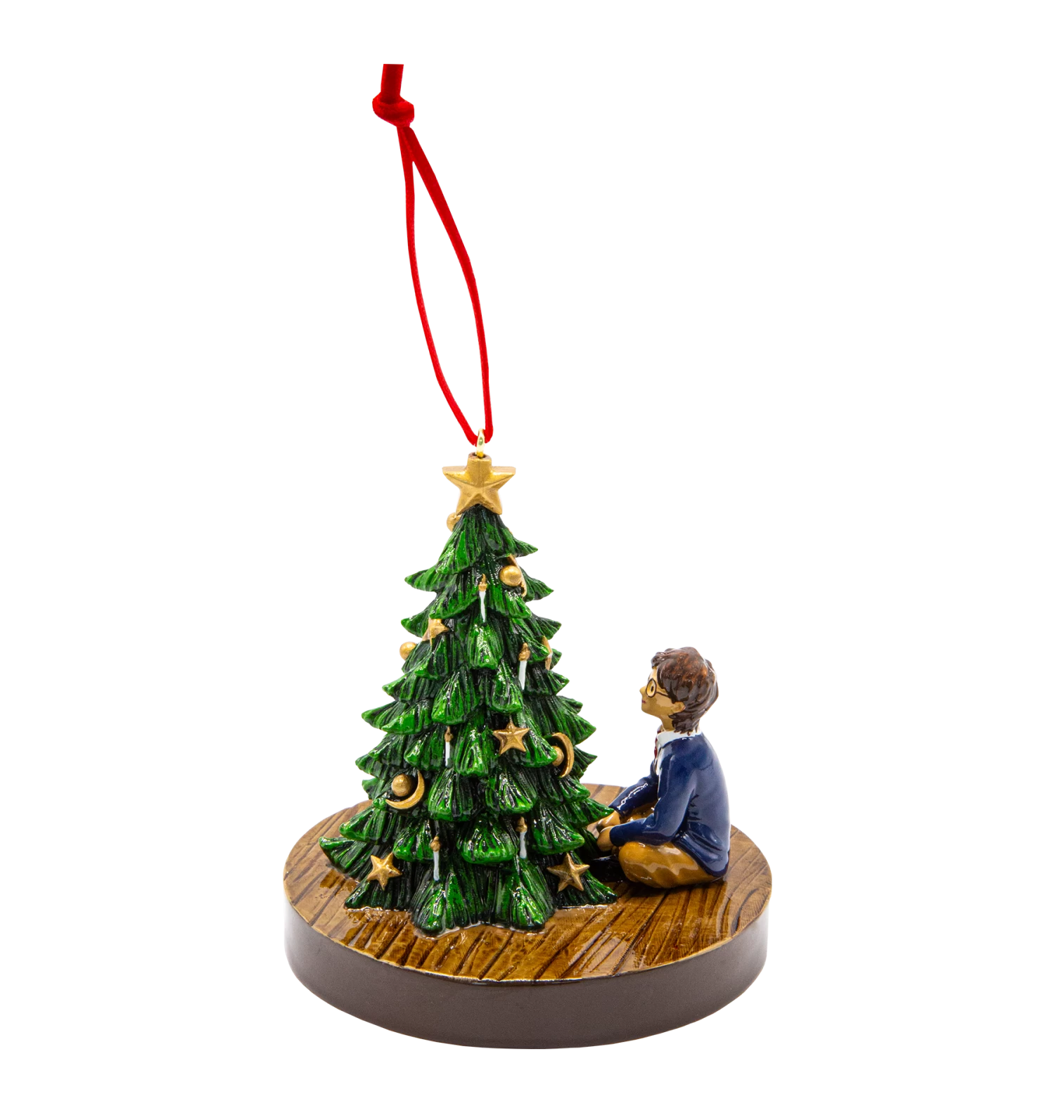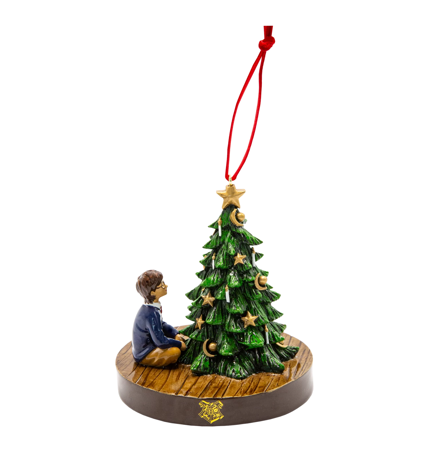 Direct from the scene in the film, Harry sits in the Great Hall next to a fully decorated tree covered in candles, golden moons, and stars. One look and you can easily imagine Ron in the background proclaiming “Merry Christmas, Harry!” The attached red velvet hanging loop can be used to grace your tree, mantle, or any space in need of a festive touch with this stunning work of art.Â