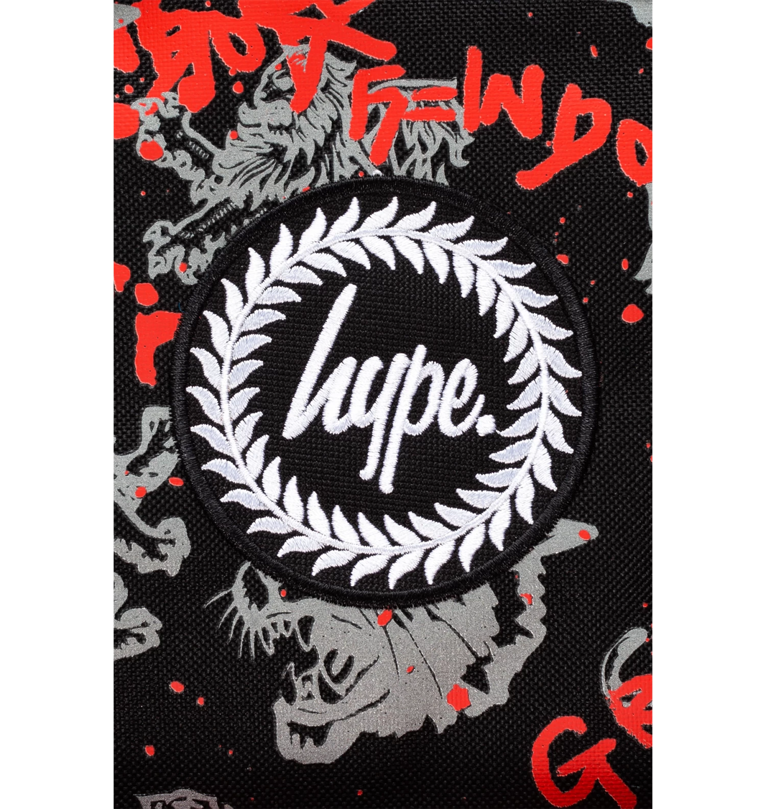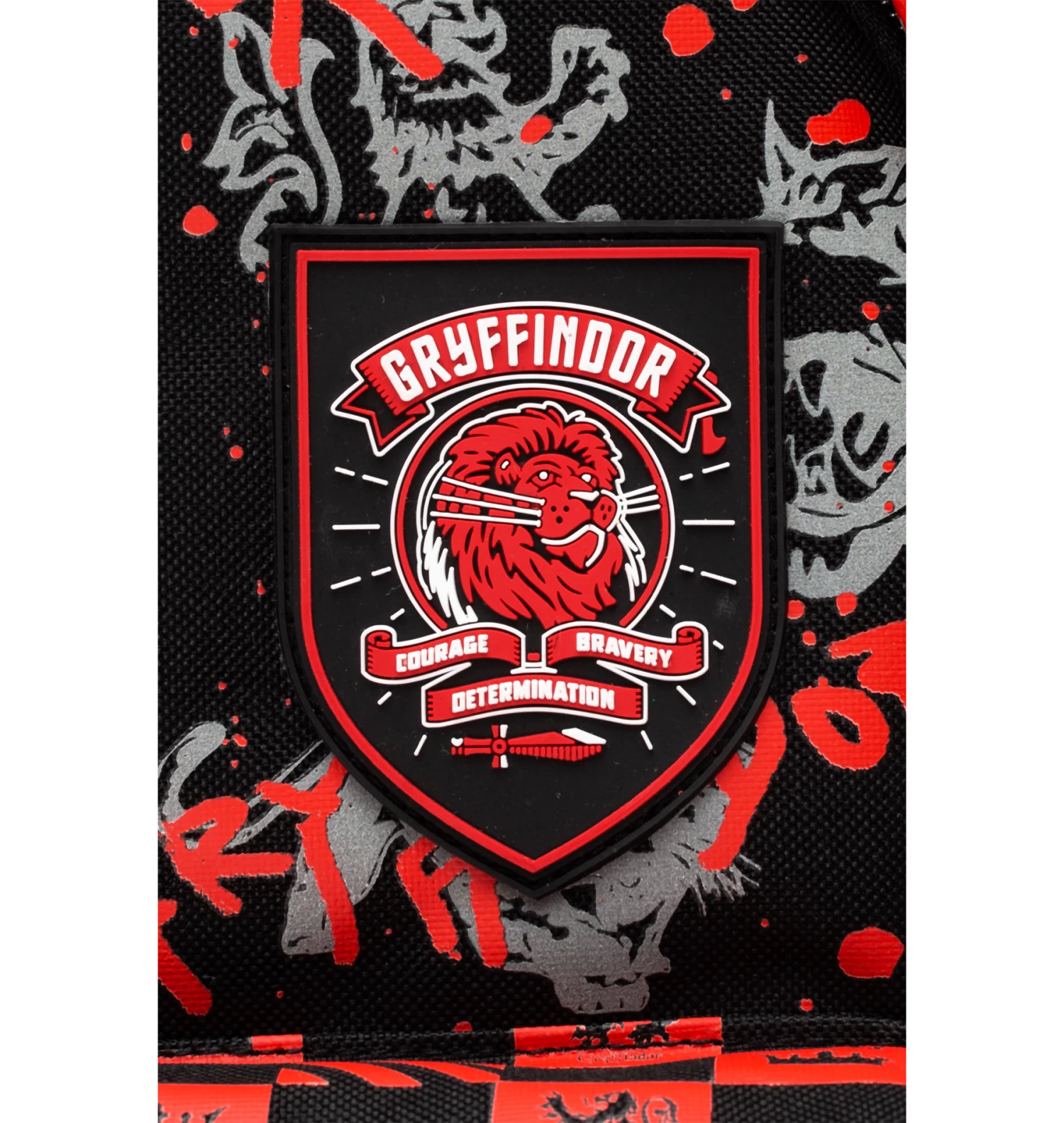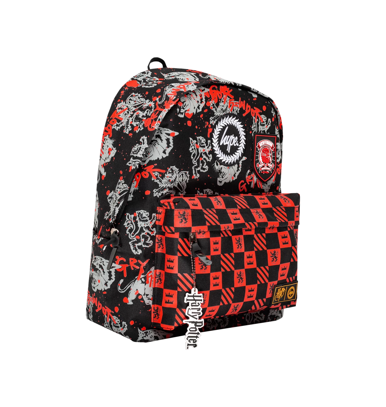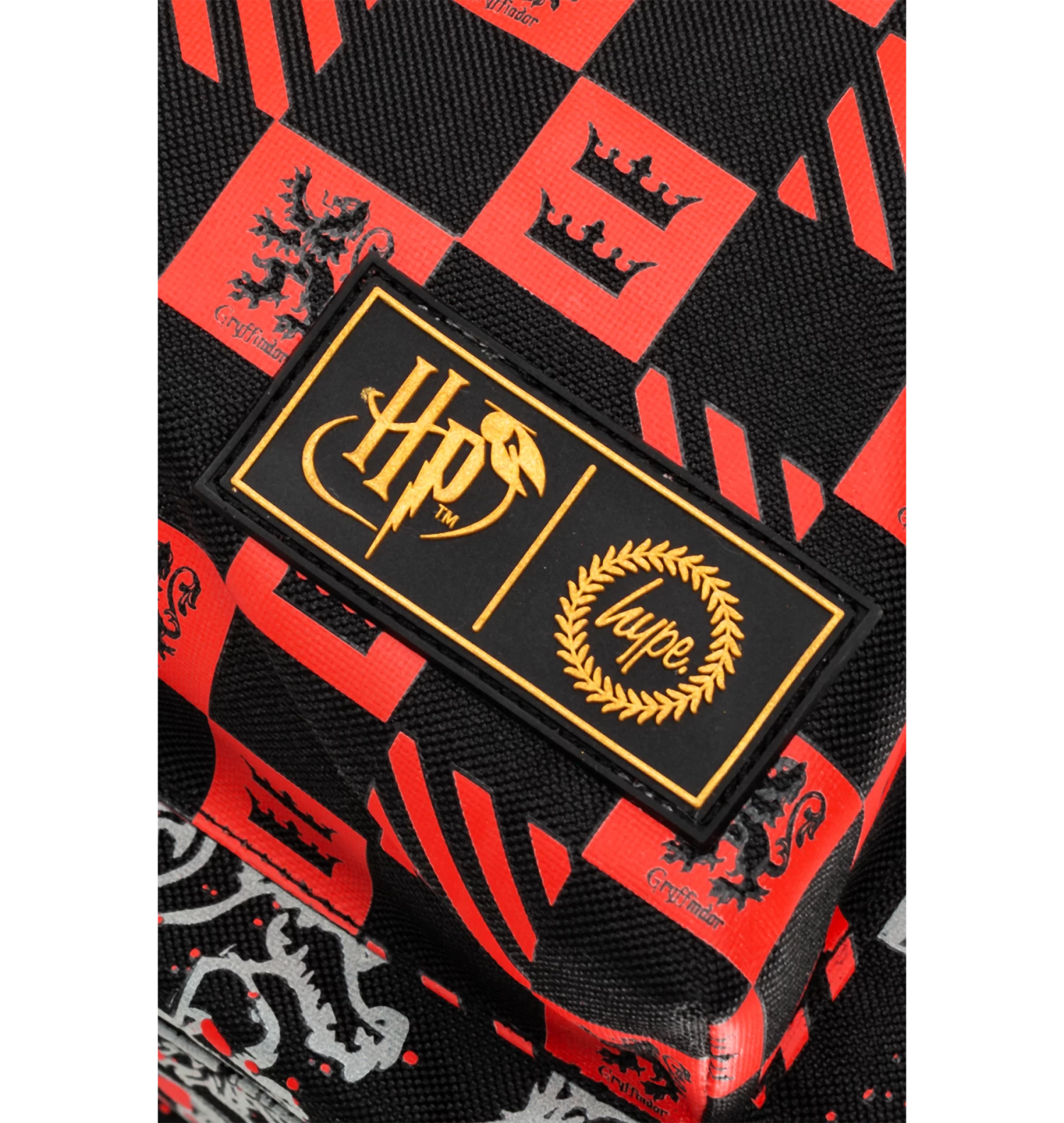 Featuring a black and white Gryffindor lion repeat print and a front pocket with a red and black checkerboard design. Finished with a grab handle, front pocket, comfortable over-the-shoulder straps, a Harry Potter keychain, Gryffindor crest, and the iconic HYPE. crest logo. Wipe clean only.