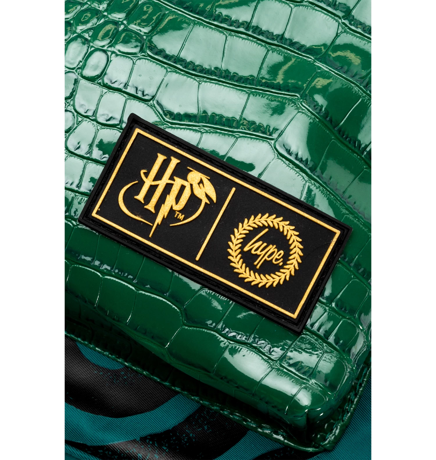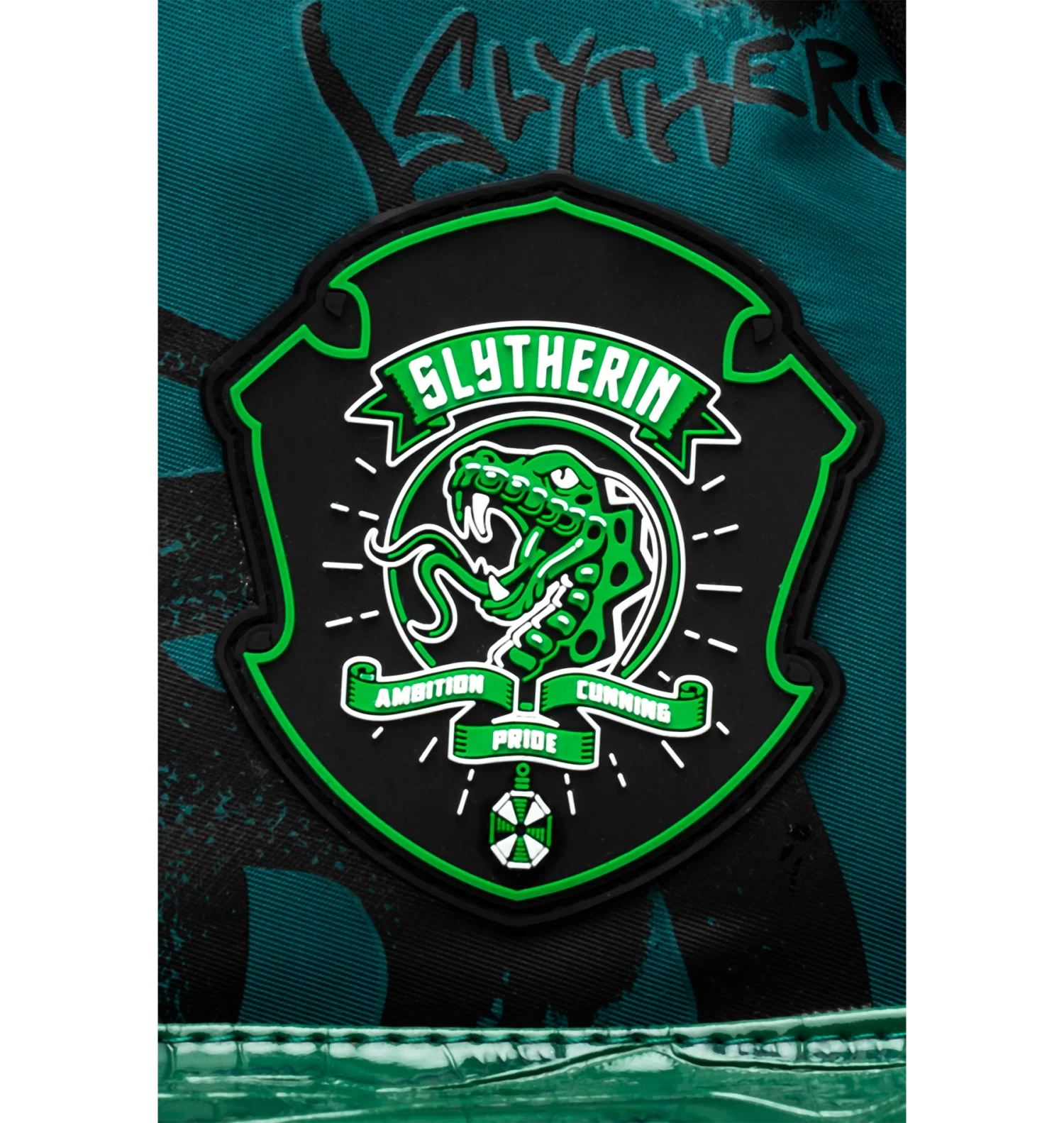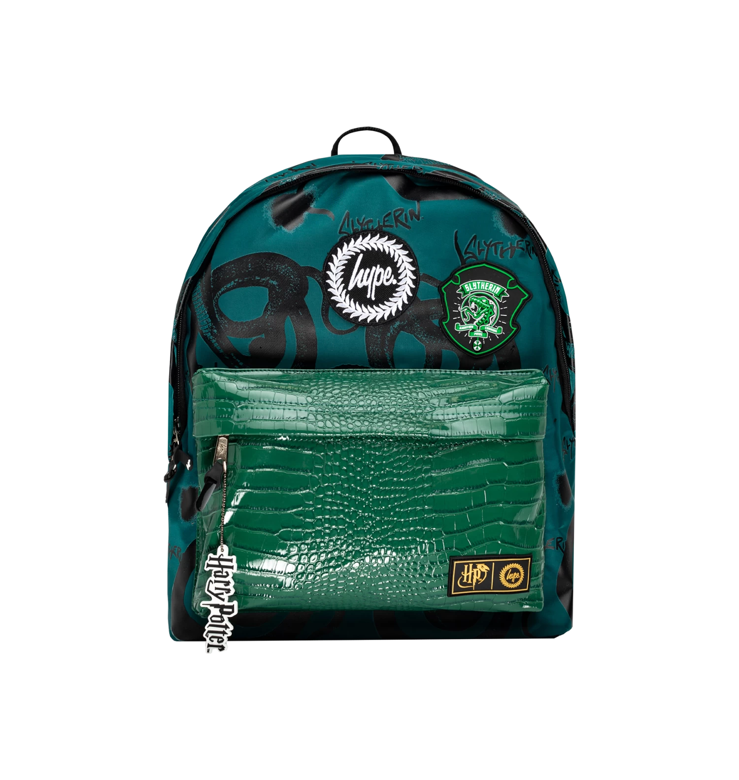 Featuring a green and black Slytherin snake print and a green faux snakeskin front pocket. Finished with a grab handle, front pocket, comfortable over-the-shoulder straps, a Harry Potter keychain, Slytherin crest, and the iconic HYPE. crest logo. Wipe clean only.