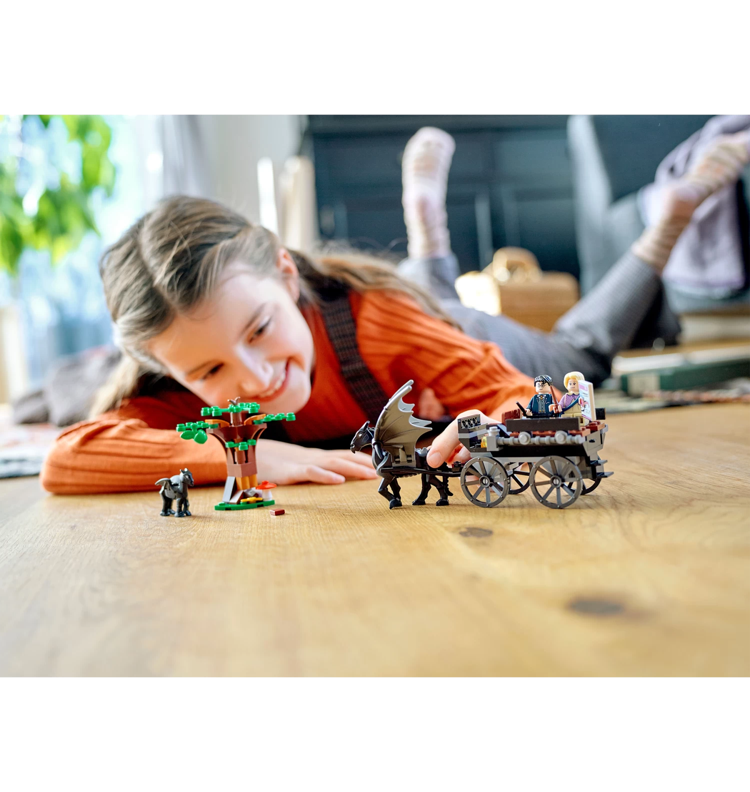 LEGO Harry Potter Hogwarts Carriage and Thestrals is a buildable toy for children aged 7 and up, with magical creatures to care for and carriage rides to enjoy for endless adventures.