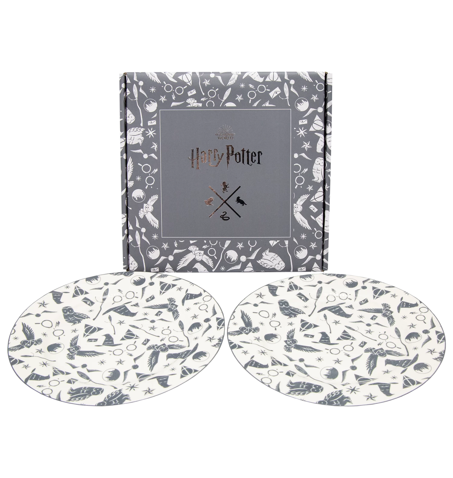 Conjure an epic feast fit for the grand halls of Hogwarts right in the comfort of your own home, with our exquisite Hogwarts homeware! This magical set features two 19cm diameter new bone china dessert plates, beautifully adorned with the grey and white pattern of Hogwarts Icons.
