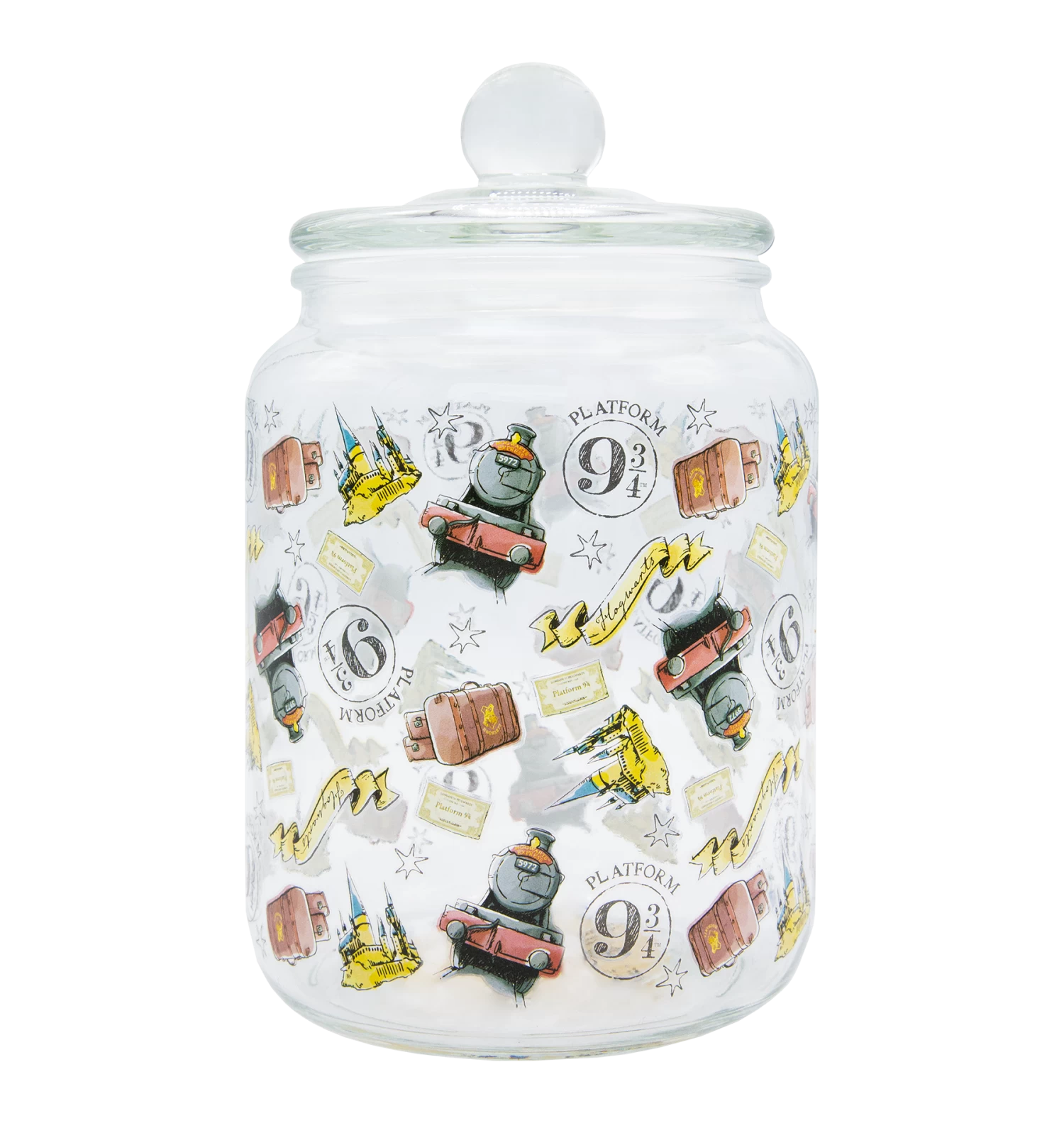 Crafted with precision and care, this cookie jar is made of soda lime glass, ensuring both durability and a touch of elegance. The all-over pattern print features iconic elements such as the Hogwarts Express, Hogwarts tickets, Hogwarts trunks, Hogwarts Castle, and the legendary Platform 9 3/4 signage. Let the imagery transport you to the bustling platform, evoking memories of extraordinary journeys and wizarding adventures!