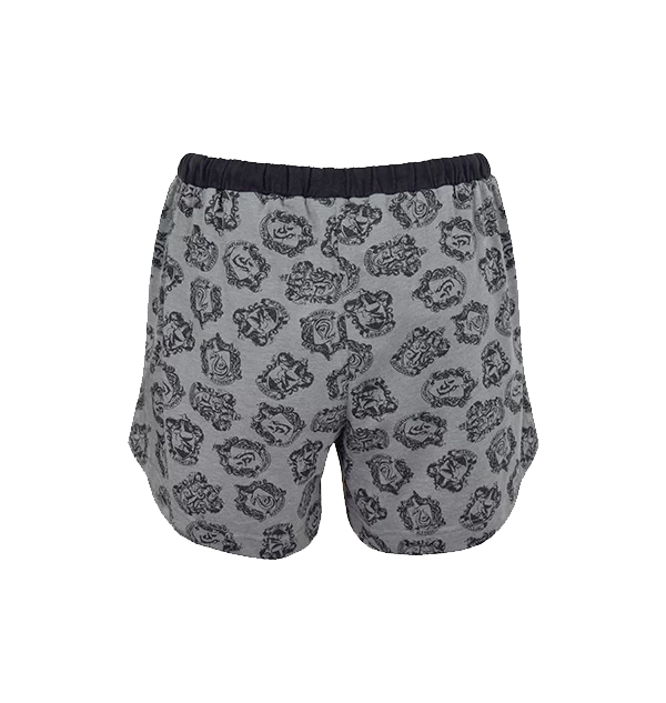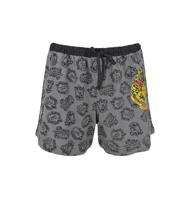 These Hogwarts lounge shorts feature an all over print of the four house crests and a large Hogwarts School Crest on the front.