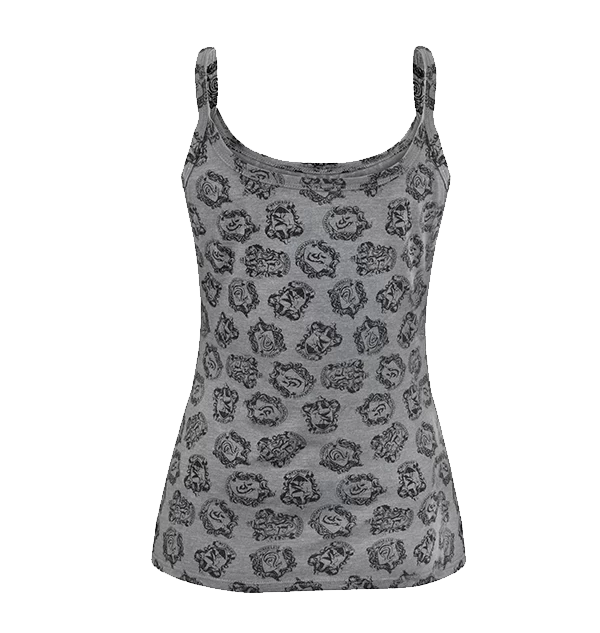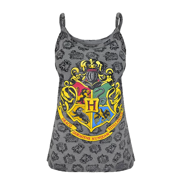 This Hogwarts lounge vest top features an all over print of the four house crests and a large Hogwarts School Crest on the front.