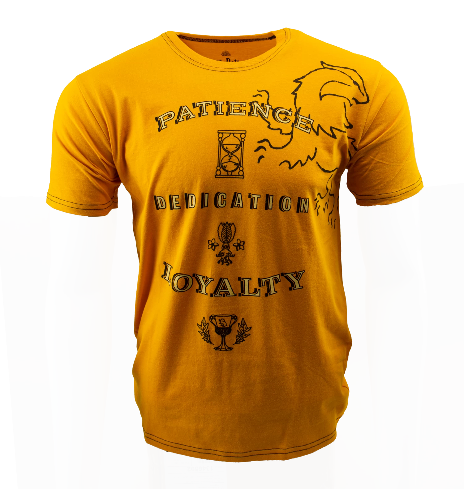 Hufflepuff house colours pop on a bright yellow cotton, Available in a generous range of adult unisex sizes, including S-3XL.
