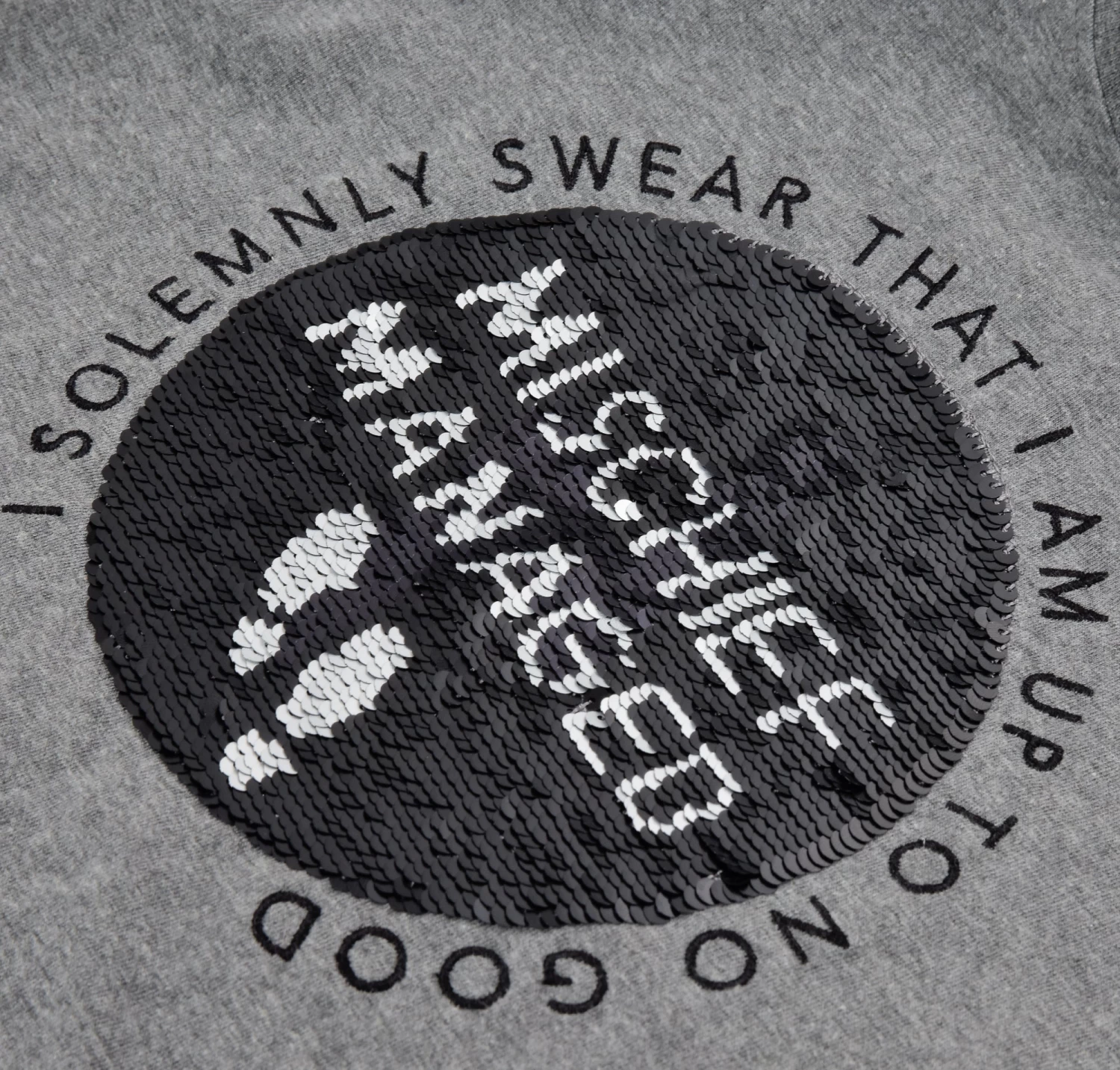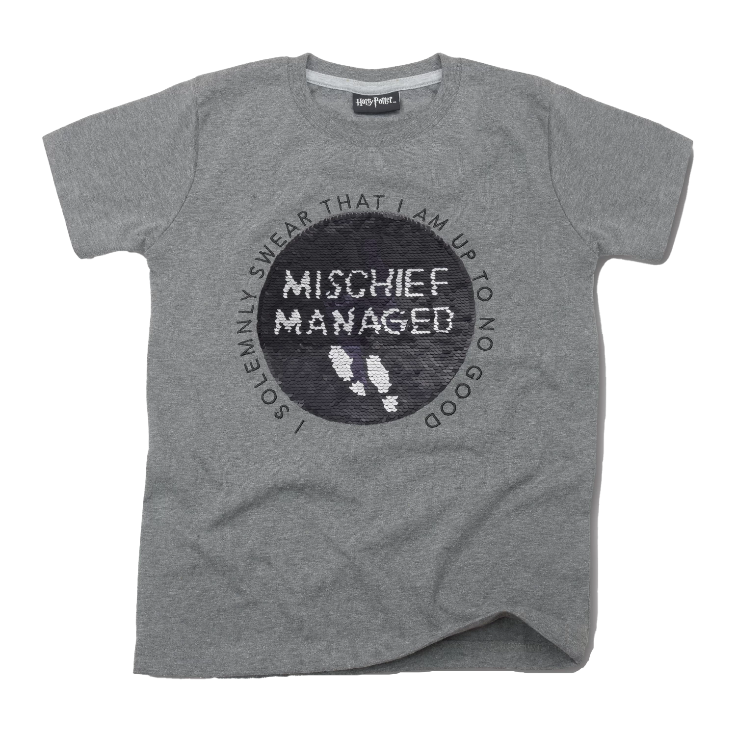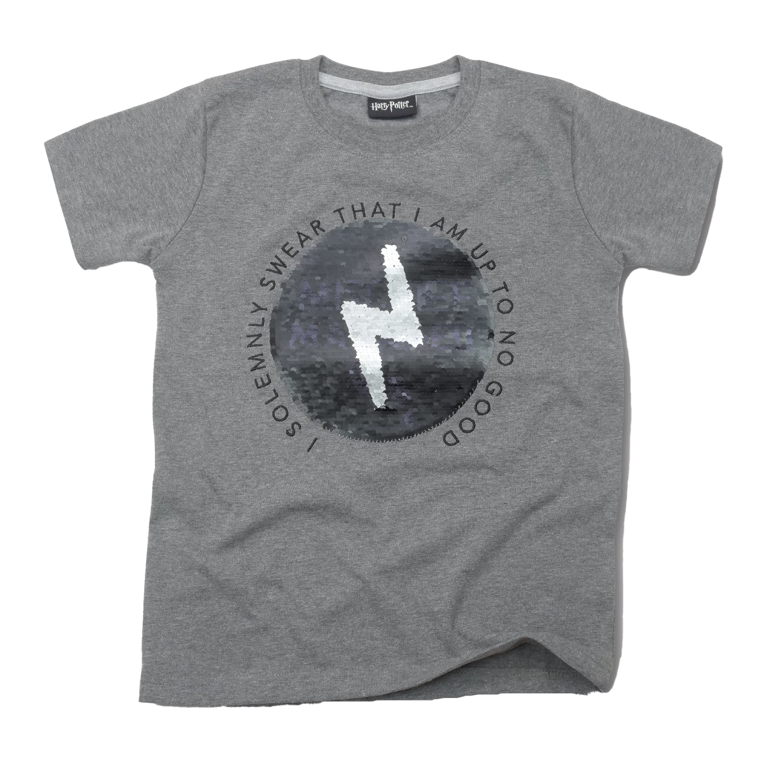 Unleash some magical mischief with this captivating Marauder’s Map kids t-shirt. This enchanting grey shirt showcases a mesmerizing black and silver sequin Mischief Managed logo on the front, ready to astonish. Brush the sequins upward to reveal a hidden lightning bolt image! Completing the spellbinding design, circular embroidered text reads ‘I solemnly swear that I am up to no good,’ capturing the spirit of the Marauder’s Map.