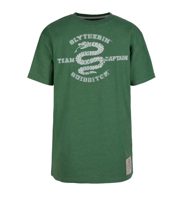 Join the Slytherin Quidditch team with this Kids Slytherin Quidditch Team Captain t-shirt. The t-shirt is a green colour, the traditional colour of the Slytherin house, and features a raised flock print design across the chest in grey of the Slytherin house animal, a snake.