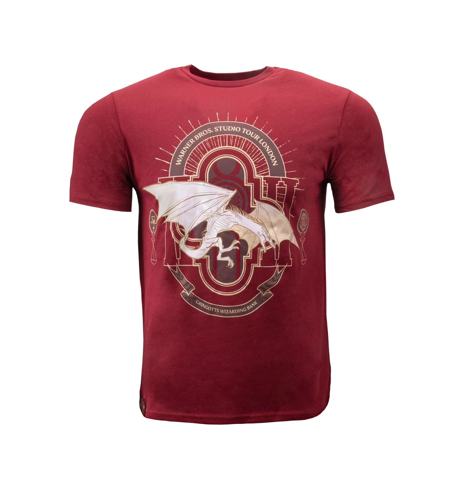 This exclusive crimson-red t-shirt is unique to the London Iconic Gringotts collection and features a striking graphic illustration of the white Ukrainian Ironbelly dragon flying over top a geometric design,Ā representing the dramatic break-out from Gringotts Bank vault.