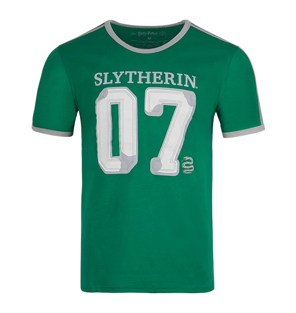 Celebrate your Hogwarts house loyalty with this bespoke Slytherin House Seeker T-Shirt. The short-sleeved t-shirt comes in the traditional house colour green which is combined with grey stripes along each sleeve. The number 07 is printed in a grey and white design in the centre of the t-shirt alongside the word Slytherin which is printed across the chest in grey. This personalised Slytherin t-shirt is complete with an embroidered grey serpent, the iconic Slytherin house animal.