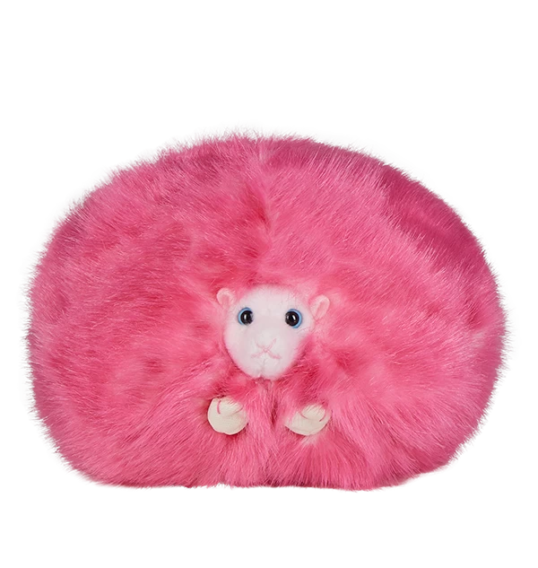This pink Pygmy Puff plush with sound has fluffy, medium pile polyester fur in variegated shades. Tiny white feet protrude from its fur and bright blue acrylic eyes stand out against its pale pink face.