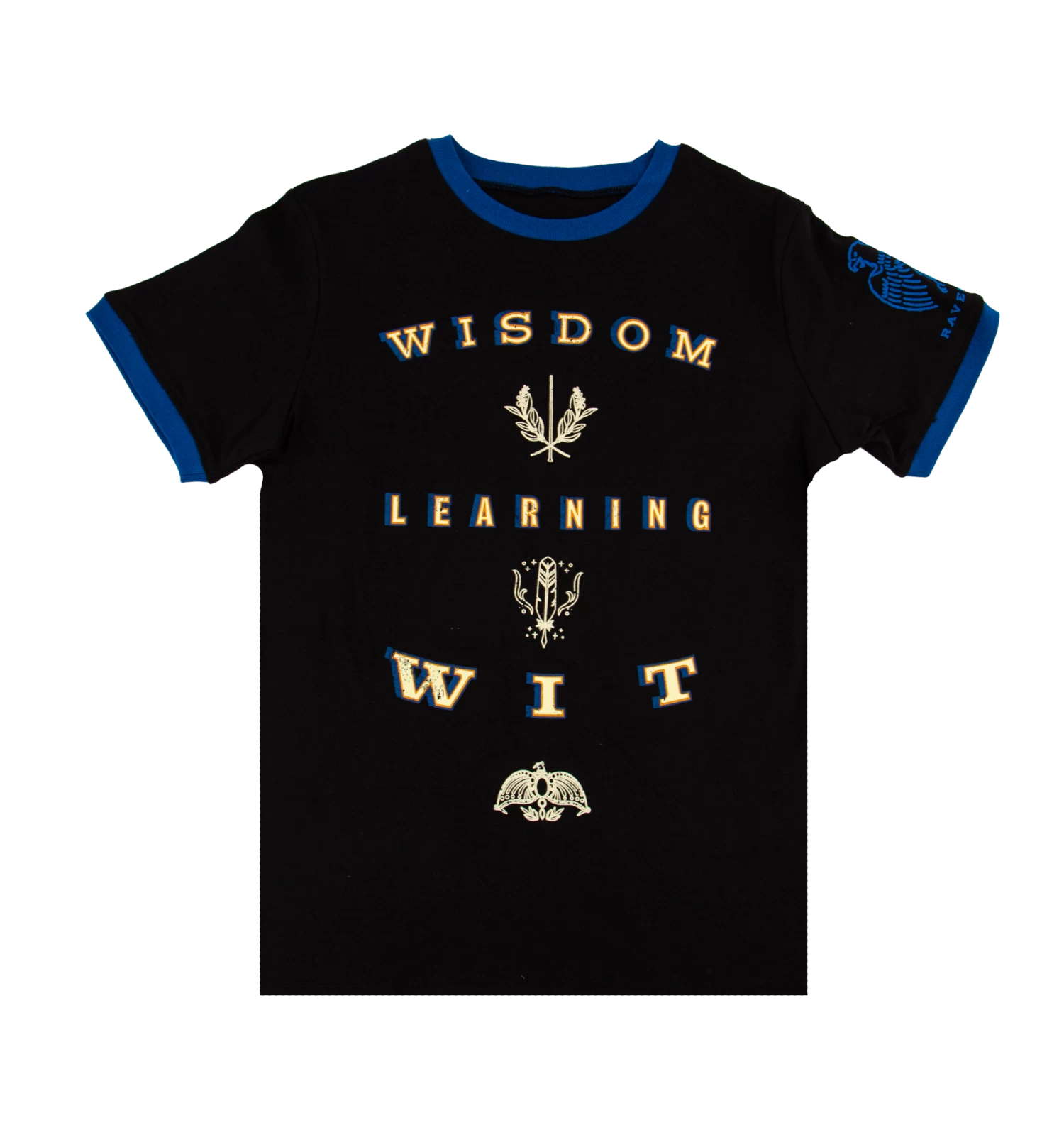 This trendy kids t-shirt is covered in various Ravenclaw symbols, along and the famous Ravenclaw eagle in raised puff-ink on the left sleeve. The front of the shirt proudly displays the three most prominentĀ traitsĀ associated with the house: Wisdom Learning and Wit in bold, distressed fonts.