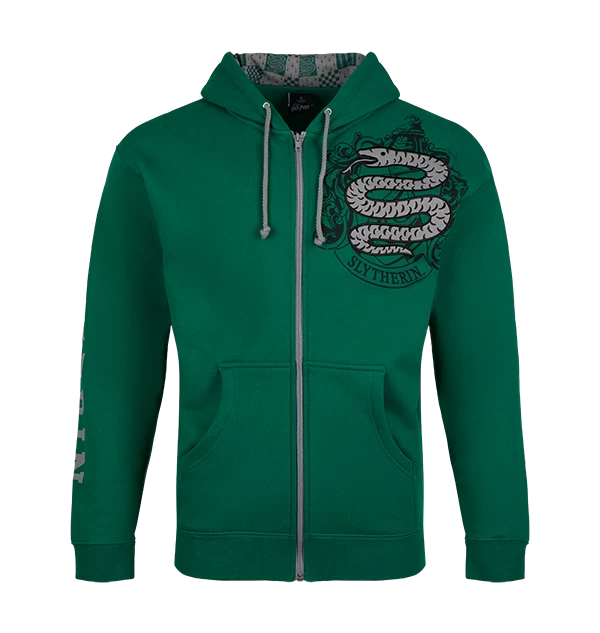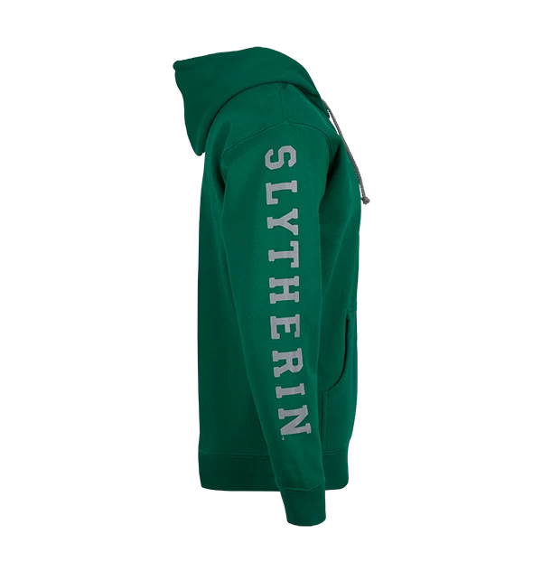 The text ‘Slytherin’ is screen-printed along the sleeve in grey. The hoodie also includes a full tunnel pocket in front, a grey zip and two grey strings which can be adjusted for a suitable and comfortable fit.