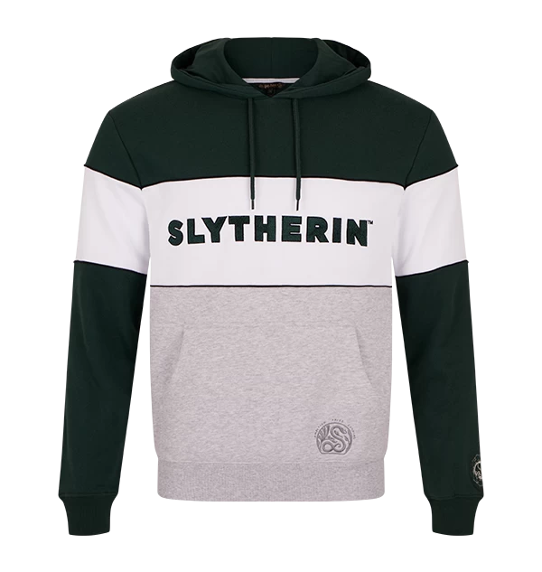 Get ready for the Sorting Hat ceremony with this bespoke Slytherin Hoodie. The hoodie features a colour block design in white, light grey and emerald green, the traditional colour of Slytherin. The hoodie is complete with the text ‘Slytherin’ appliqued across the chest.