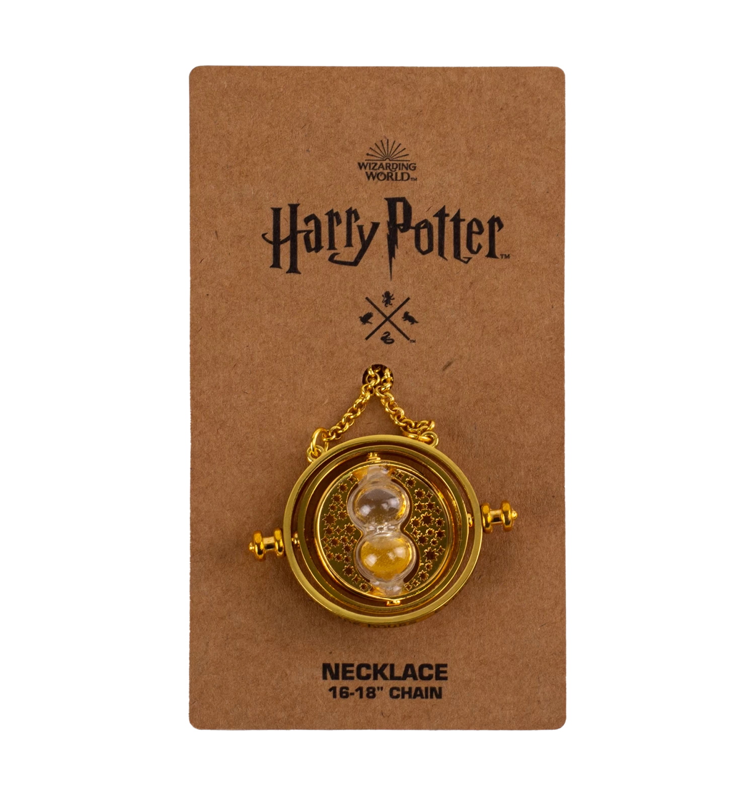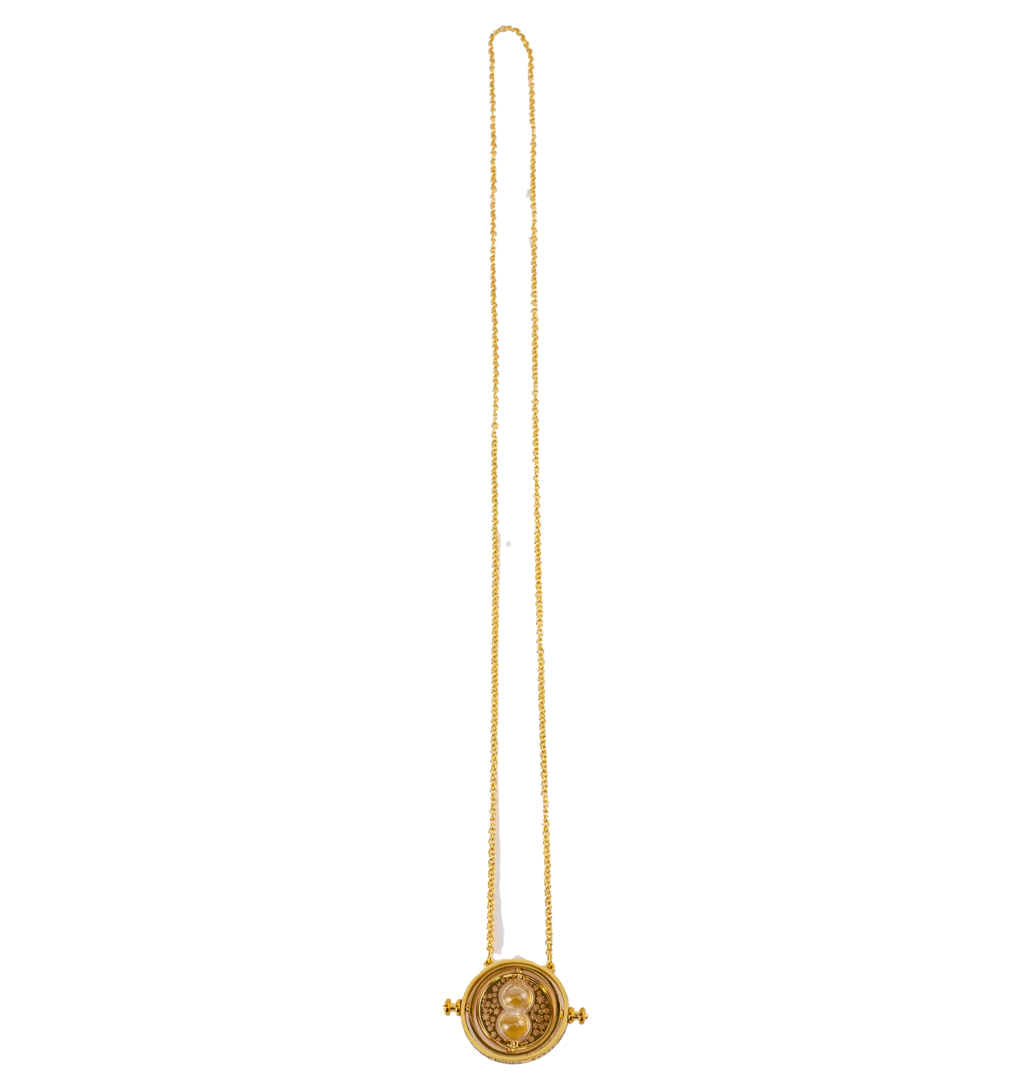 This Time-Turner Pendant Necklace features miniature hourglass detailing and measures approximately 2cm in diameter. It includes a gold plated link chain which is 40cm with a 5cm extender and comes on official Harry Potter branded card packaging. This decorative pendant is designed to be functional and imitates the rotation of the original prop from the films.