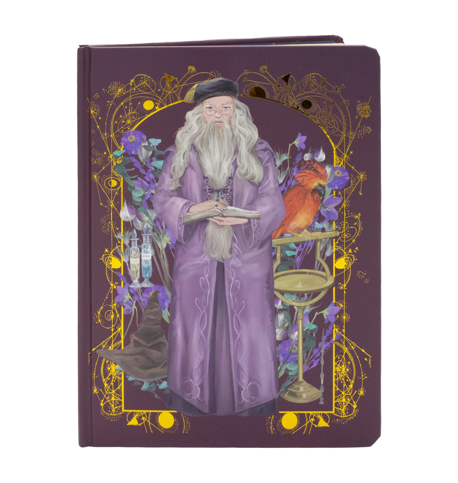 Professor Dumbledore stands holding a magical tome, surrounded by brilliant purple blooms and metallic gold symbols. Fawkes the phoenix can be seen perched at his side, while the Sorting Hat sits just behind the hem of his robe. Open the first page to potion bottle detailing on the inner cover. Also includes ruled pages with gold metallic highlighting on the edges and a deep maroon ribbon to mark your place.